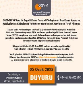 Engelli Kamu Personel Seçme Sınavı ve Engellilerin Devlet Memurluğuna Alınmaları Hakkında Yönetmelik uyarınca ÖSYM tarafından yapılan Engelli Kamu Personeli Seçme Sınavı (EKPSS) sonuçları ve kura usulü ile kamu kurum ve kuruşlarının boş kadrolarına yerleştirme yapılacak.