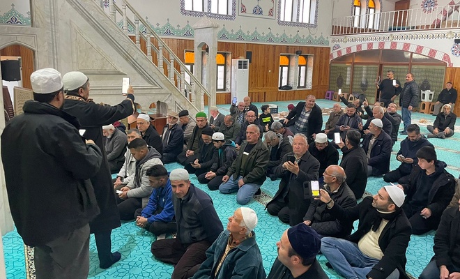 Bu sırada sabah namazı buluşmasında vaazı dinleyen cemaatten cep telefonlarını çıkarmalarını isteyen Müftü Fidan, kısa mesaj ile kampanyalara destek verilmesini istedi.